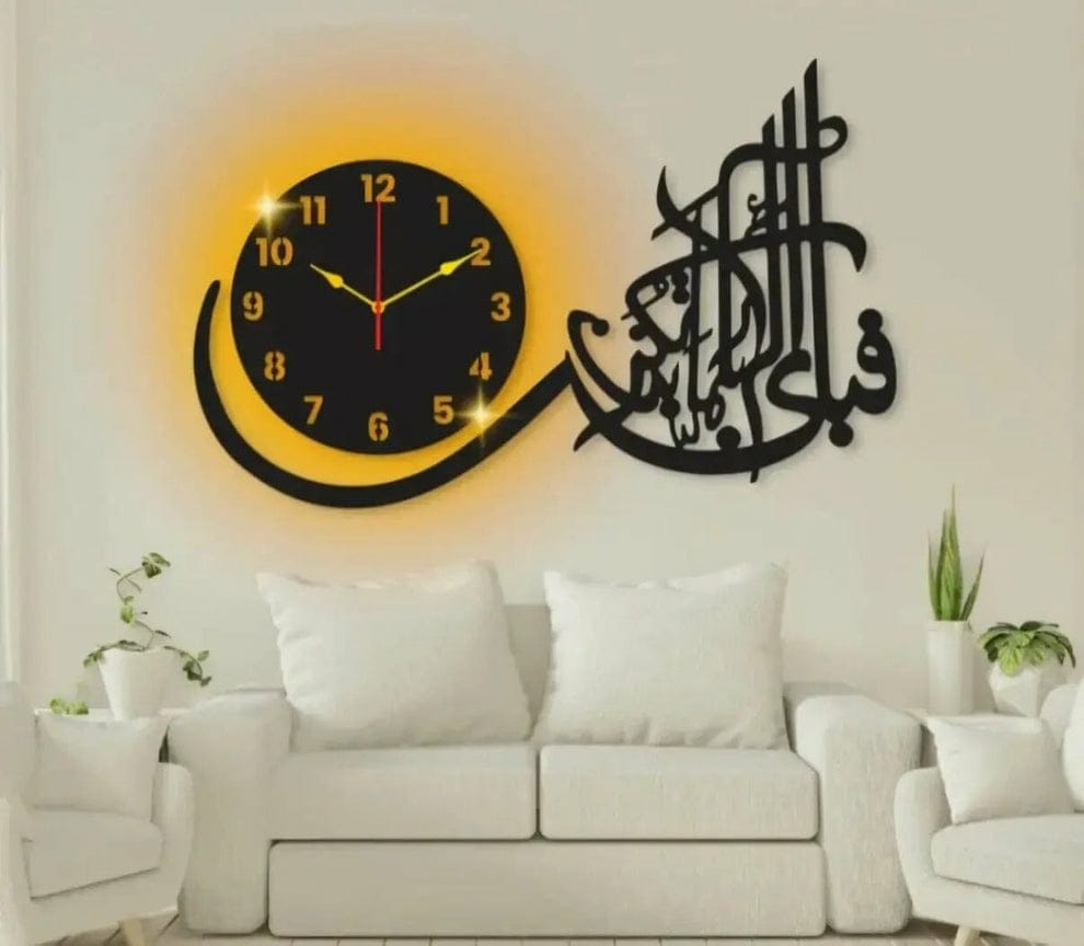 “Adorn your home with this Surah Ar-Rahman calligraphy wall clock. Featuring Fabi Ayyi Ala’i Rabbikuma Tukazziban in stunning calligraphy, premium wooden finish, and beautiful lighting, it brings spirituality and elegance together in one masterpiece.”