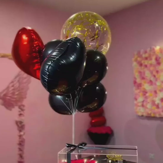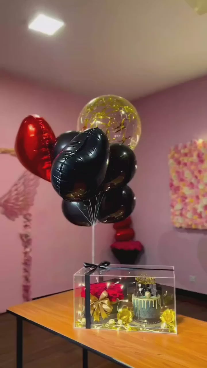 A classy birthday surprise setup featuring an elegant acrylic box, premium balloons, and a fresh flower bouquet. Perfect for gifting & celebrations. (Cake and delivery not included.)